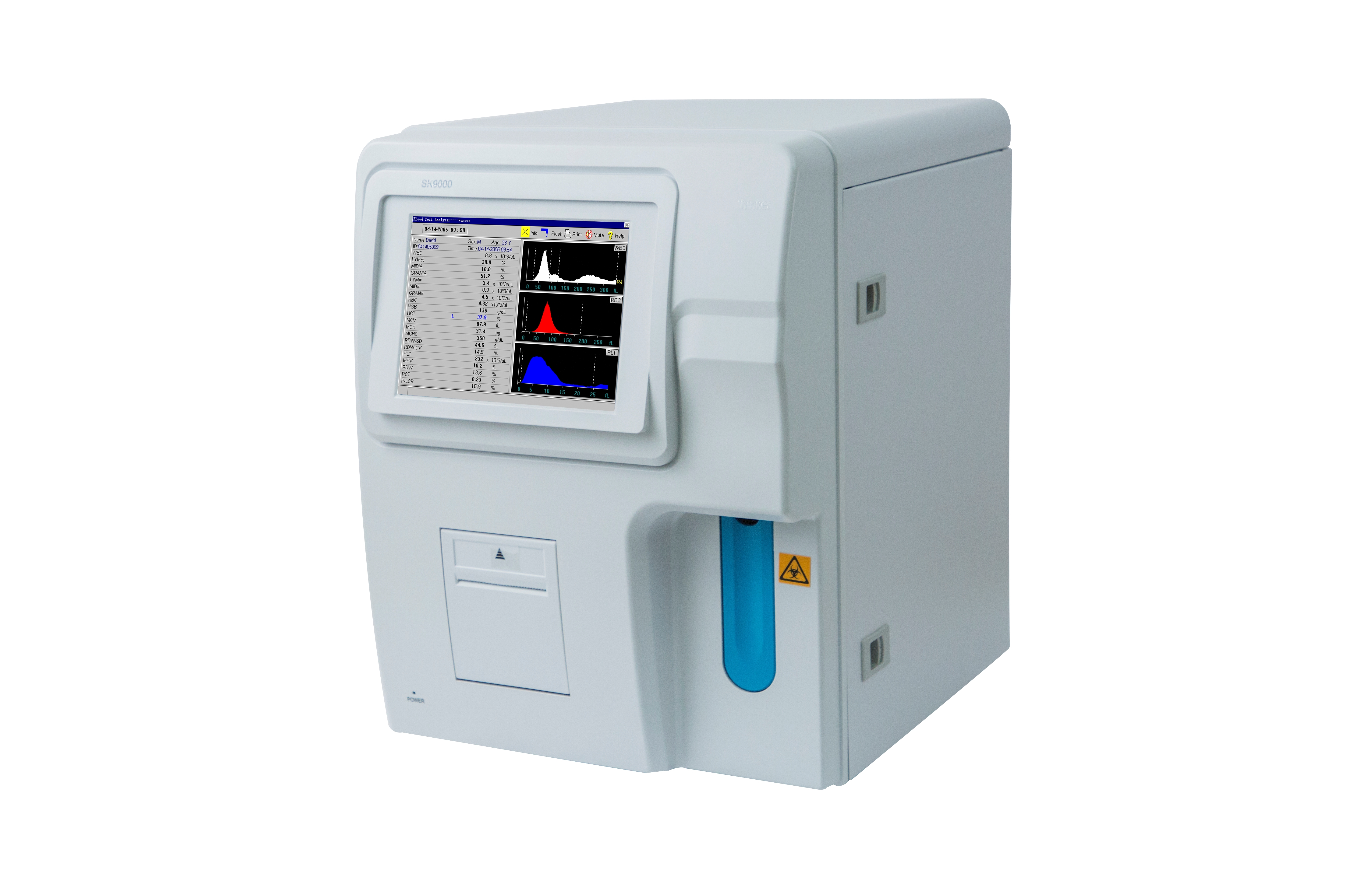 Parameter: Diferensiasi 3 bagian WBC; 20 parameter dan 3 histogram warna (WBC, RBC, PLT)